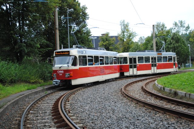 Nun ging es über die Morgenleite und die Stollberger Straße nach Gablenz bzw. in den Betriebshof Adelsberg. Dort hatten die Teilnehmer die Möglichkeit die Abstellhalle zu besichtigen. Nach der Besichtigung wurde an die Traktion noch zusätzlich der Wagen 517 an die Spitze gekuppelt.